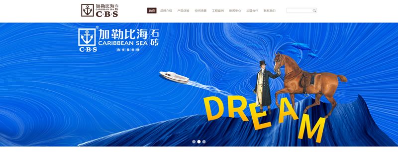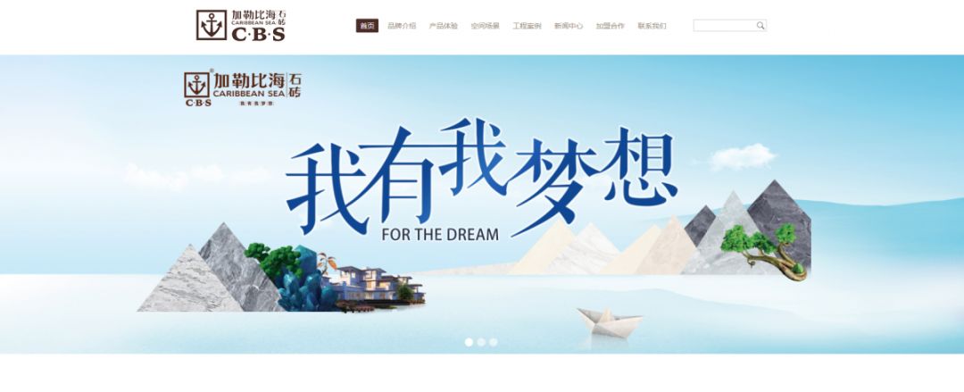 加勒比海石磚新官網采用時尚鮮明設計理念,將加勒比海品牌的時尚感融入其中,視覺設計中采用簡潔的網頁設計,配以大海、冒險配圖,平衡了整體畫面感,又能與加勒比海石磚logo相呼應,強調品牌的個性化。