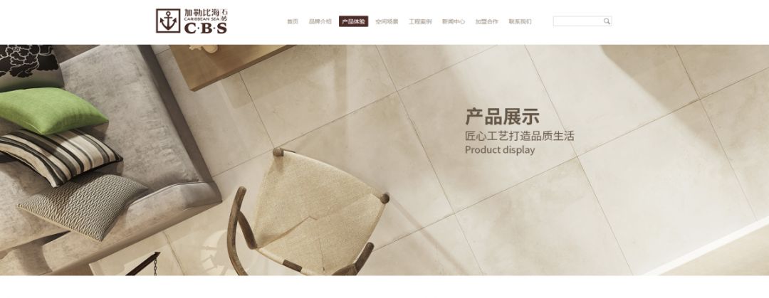 加勒比海石磚新官網,新增空間場景欄目,把各個空間場景進行區分,讓客戶迅速搜索到對應產品,進行720全景查看。